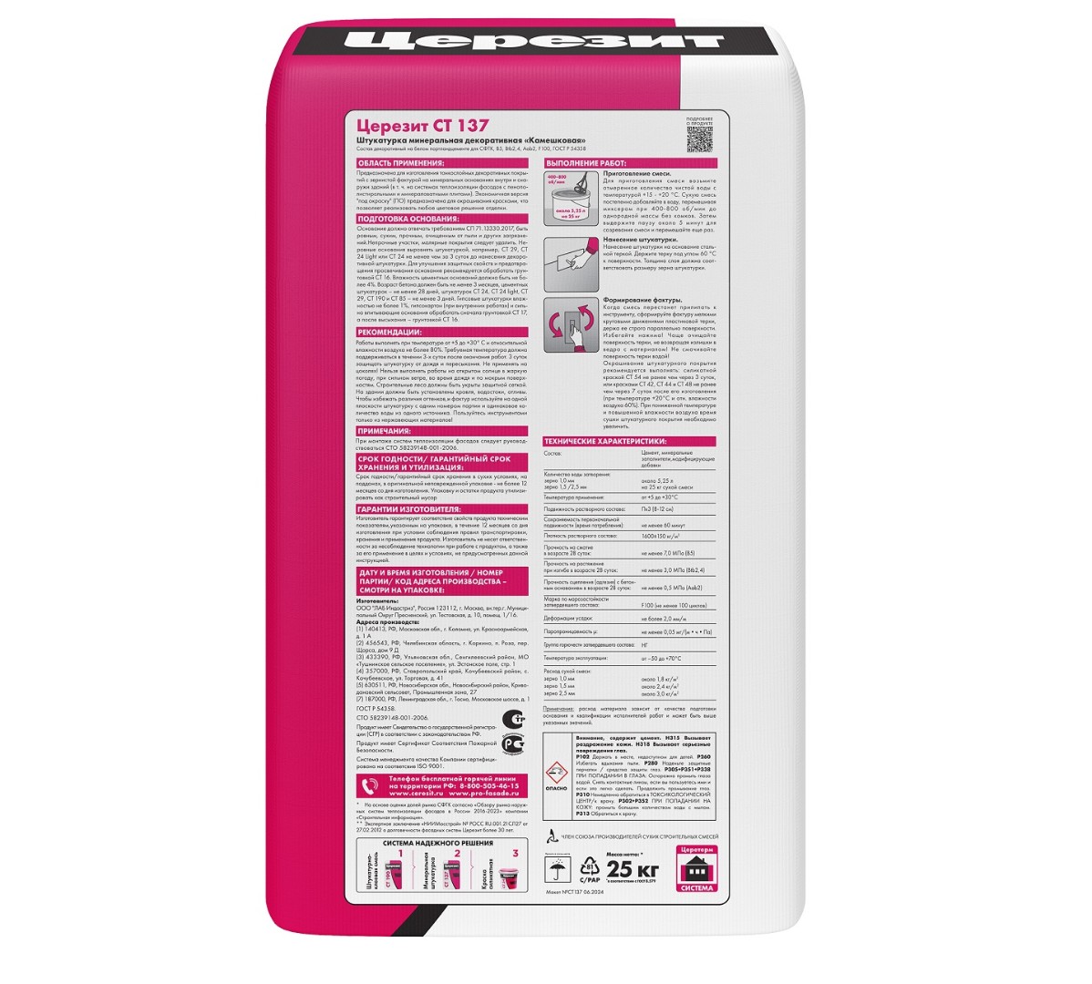 С помощью штукатурной смеси CT 137 изготавливаются декоративные тонкослойные покрытия, имеющие зернистую фактуру. Выпускается вариант белого цвета и версия, предназначенная под покраску, которая позволяет реализовывать любые цветовые решения. Существуют модификации по зернистости – 1,0; 1,5; 2,5 мм. Также имеется зимний вариант смеси для нанесения красителей при температурах ниже 0°C.
